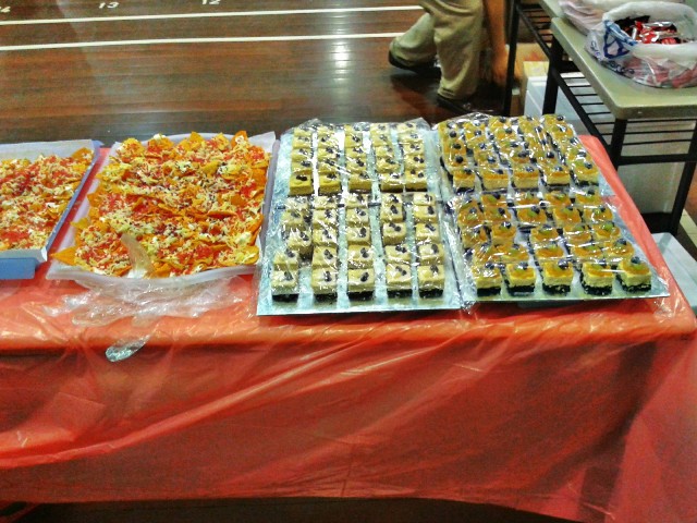 Kit-kat , 米饼。还有漏网的炒米粉,炒快熟面,辣炒年糕,小小cream puff,小小muffins ,konnyaku jelly ,笋粿,饭桃,kueh baulu , 水果(有葡萄,西瓜,李),现煮的豆花水 ,包装饮料。